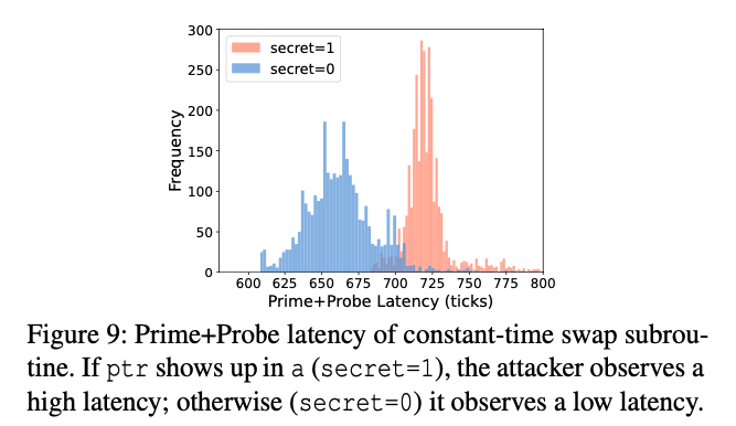- 然後攻擊者使用傳統的快取旁路攻擊(Prime+Probe)來觀察 ptr 是否由於 ct-swap 對 a 的計算而被 DMP 解參考