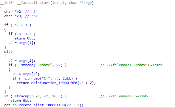 When the program is executed with the parameters update and C=<any cmd>, it will enter the MainFunction and pass the value after C= as an argument.